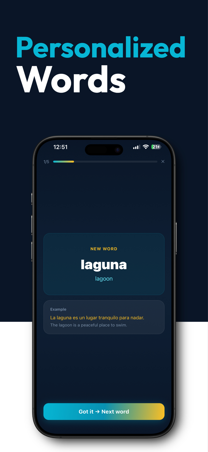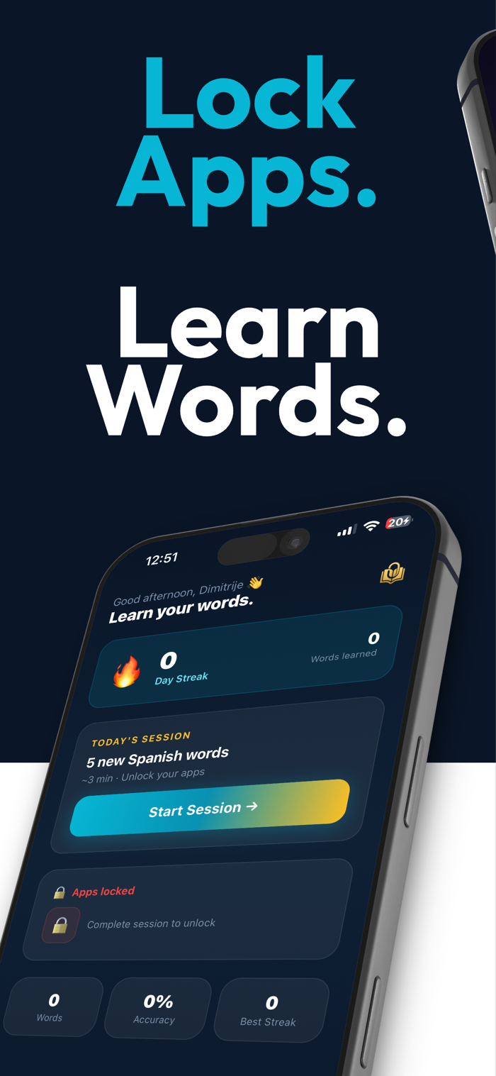 Choose the apps that distract you most - social media, games, whatever pulls you in - and lock them. The only way to unlock? Complete a quick vocabulary session.