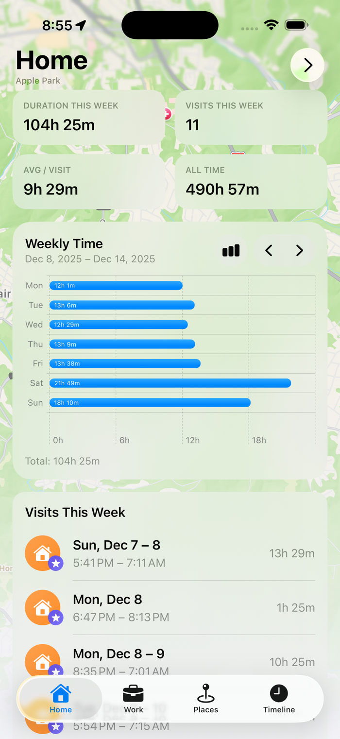 It records visits only when meaningful location changes occur, rather than constantly tracking your movement. This helps preserve battery life while still capturing your day.