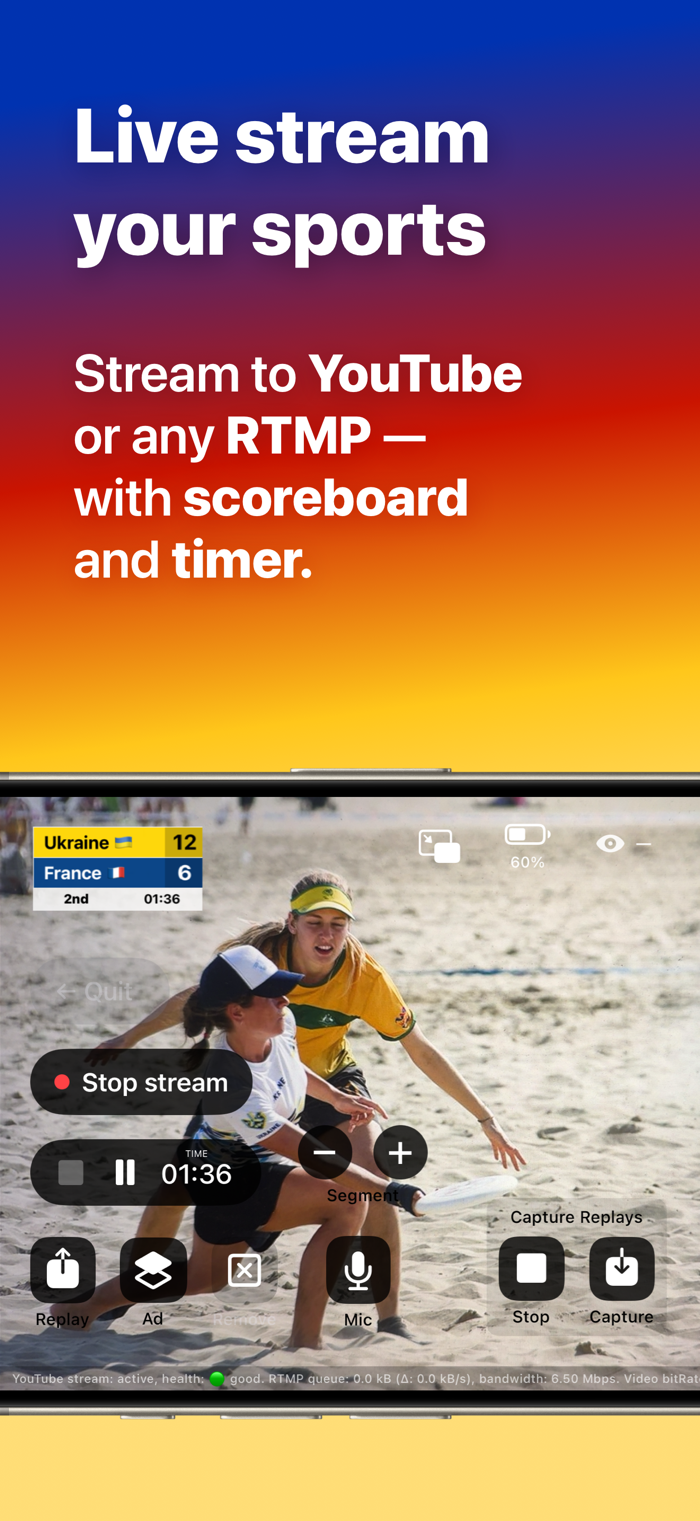Stream live sports to YouTube or any RTMP platform with professional overlays — scoreboards, timer, replays and sponsor graphics — all without extra equipment.
