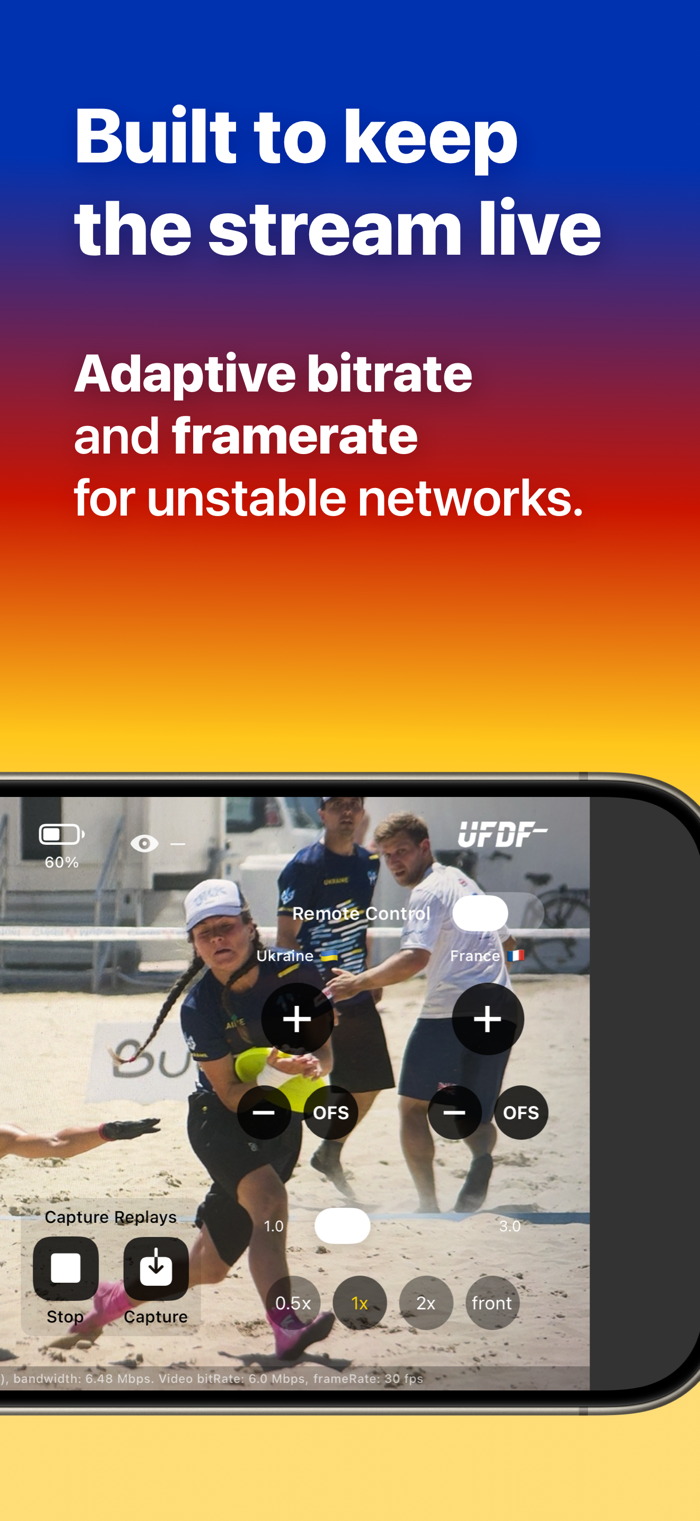 Whether you stream ultimate frisbee, football, basketball or youth tournaments, Ultimate Streamer helps you deliver a clean, reliable and professional-looking broadcast with just a few taps.