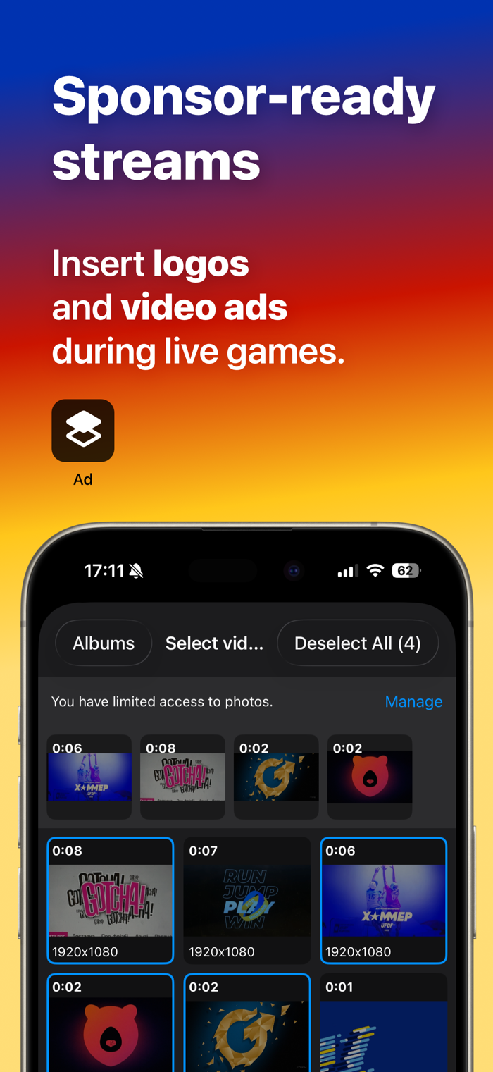 - Insert sponsor ads and logos to monetize your streams