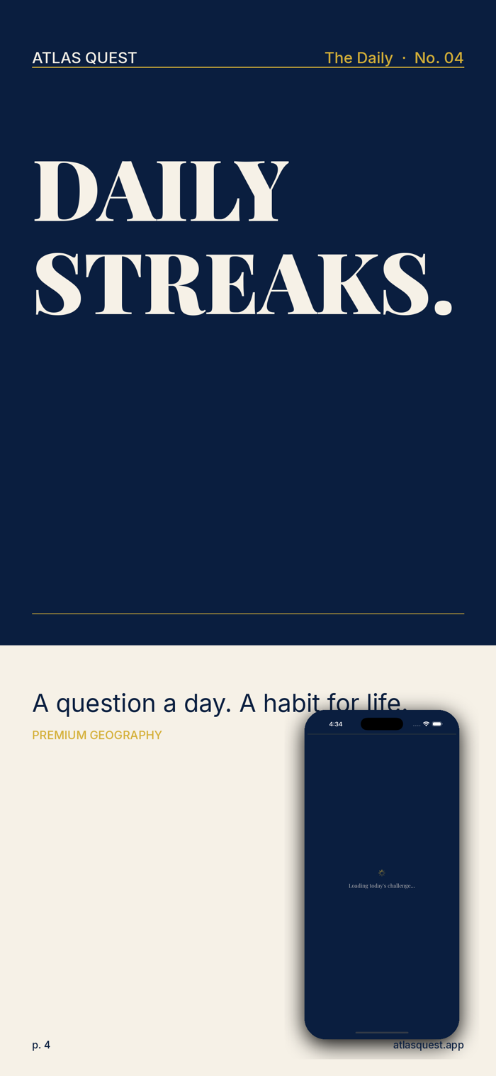 Deep navy. Cream paper. A single line of gold. Playfair Display across the top, Inter below. The pace is calm. The streak is quiet. Your progress lives on your device, not in a server you've never heard of.