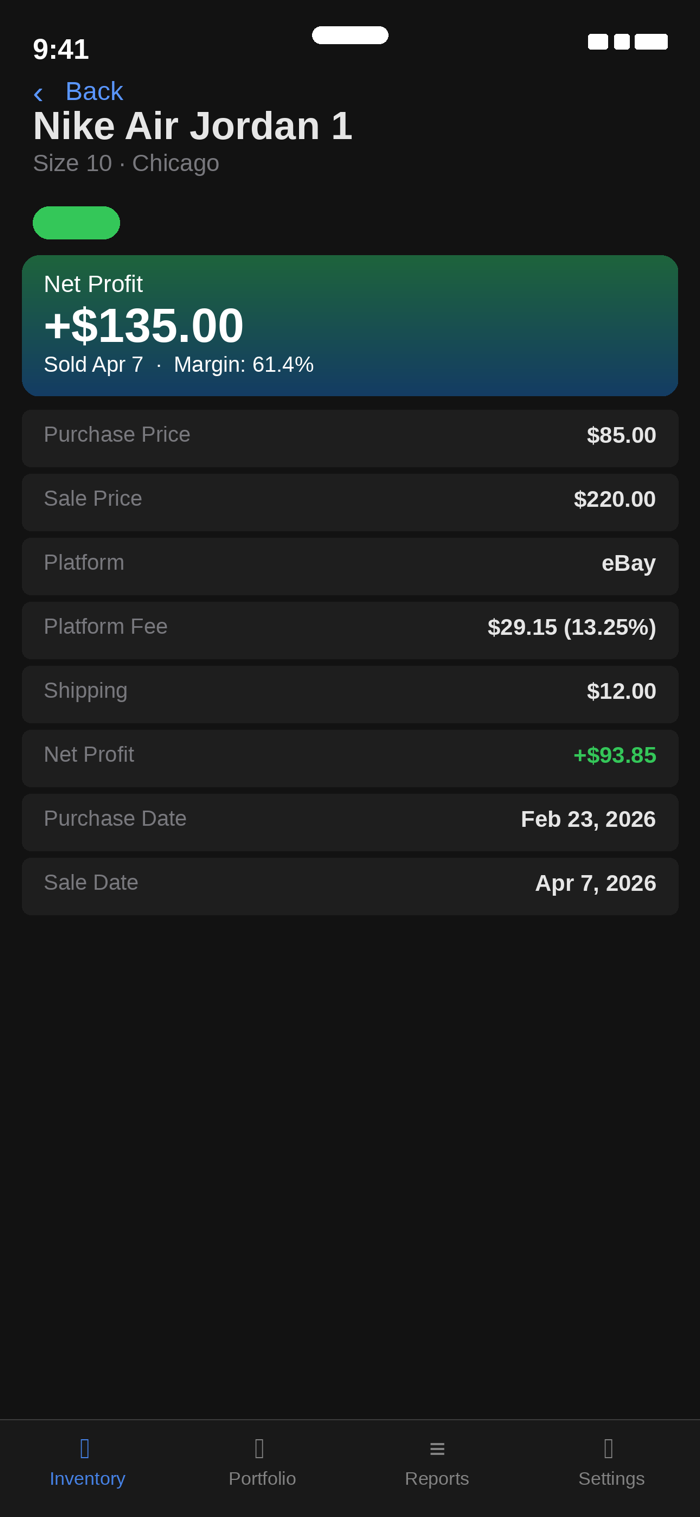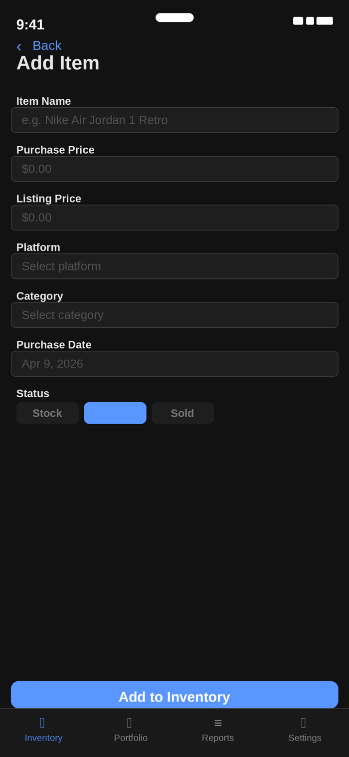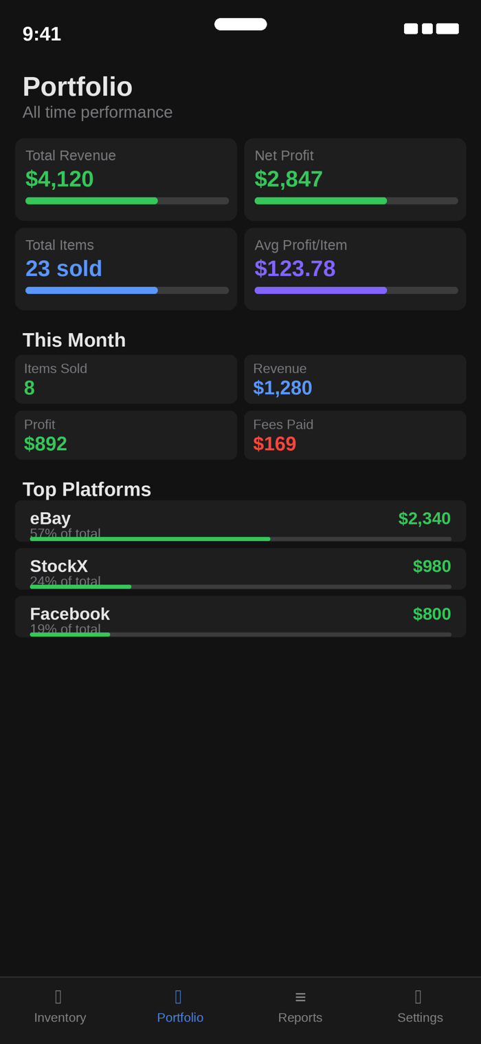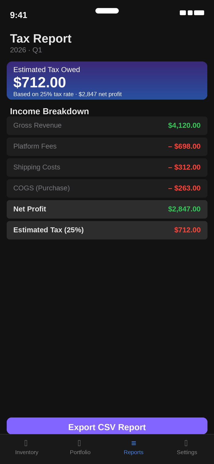 Powerful features include complete inventory management with purchase costs and selling platforms, automated profit calculations factoring in all fees and expenses, portfolio overview showing current stock value and sold items performance, and exportable annual tax reports formatted for Schedule C filing. The app handles complex scenarios like partial sales, returns, and multi-platform selling.