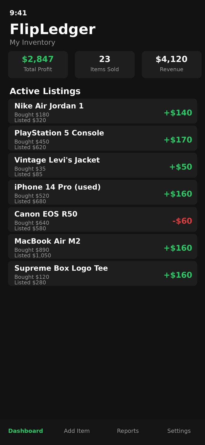 FlipLedger solves this critical problem by automatically tracking your reselling business finances. Simply log each item you buy with its cost, fees, and selling platform. When you sell, record the sale price and platform fees. FlipLedger instantly calculates your true profit per item and provides comprehensive financial insights across all your selling platforms.
