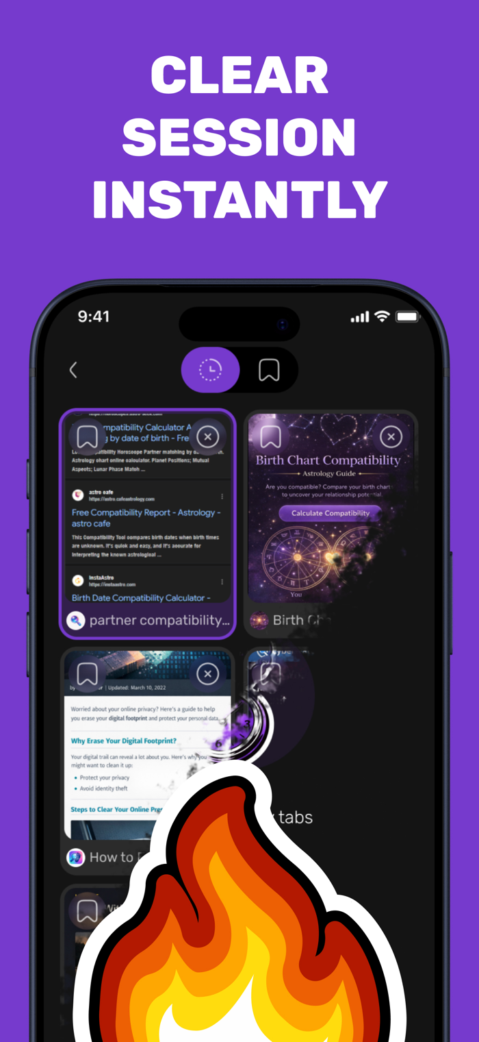 All websites open in temporary tabs that exist only during the current app session. These tabs are never restored, never added to history, and are automatically removed when the app is closed or when quick clear is used.
