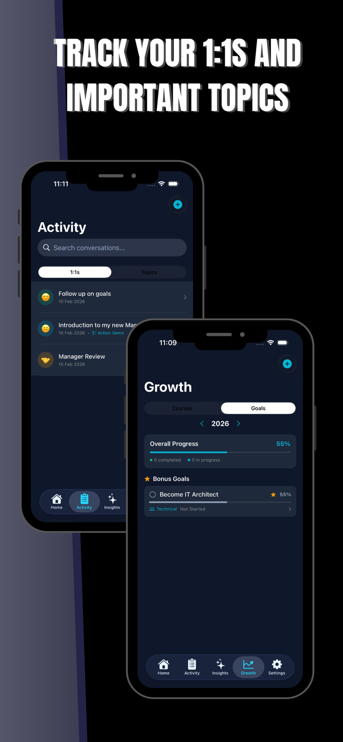 Your home screen is a real-time dashboard showing goal progress, open topics, active courses, recent meetings, and review countdowns. Everything you need to stay on top of your career — in one place.