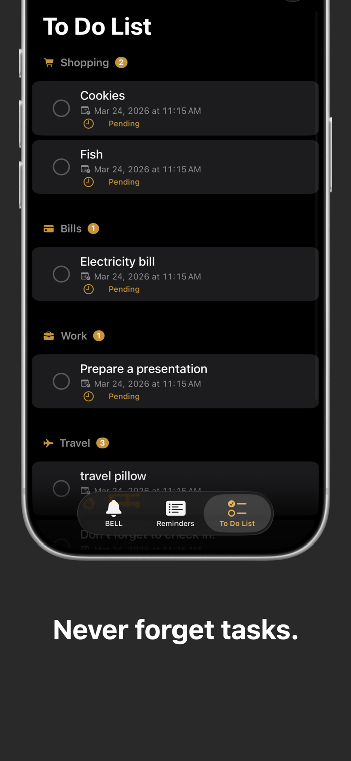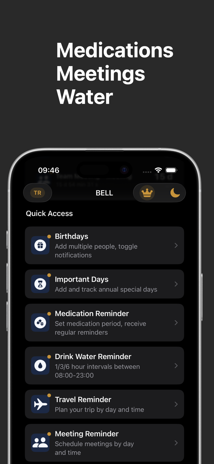 Manage birthdays, important days, medication schedules, meetings, travel plans, and To Do tasks in one clean, focused app. BELL helps you remember at the right moment with clear notifications, practical organization, and a simple flow that stays easy to use.