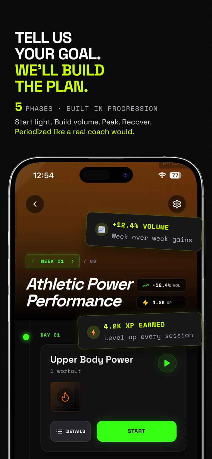 • Automatic periodization: Foundation → Build → Peak → Deload