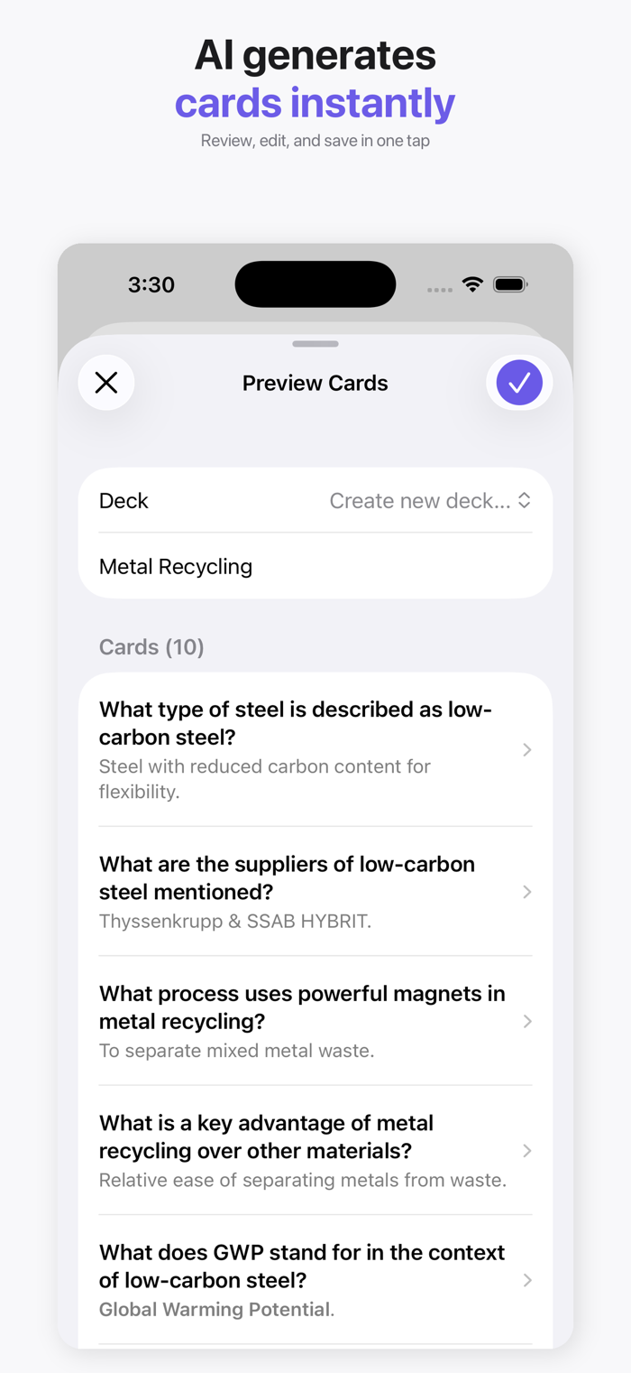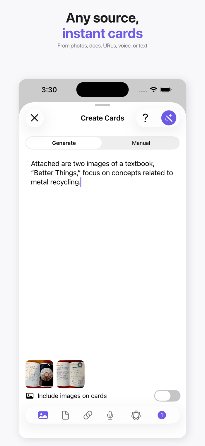 • Manual — create unlimited cards by hand, no AI credits needed