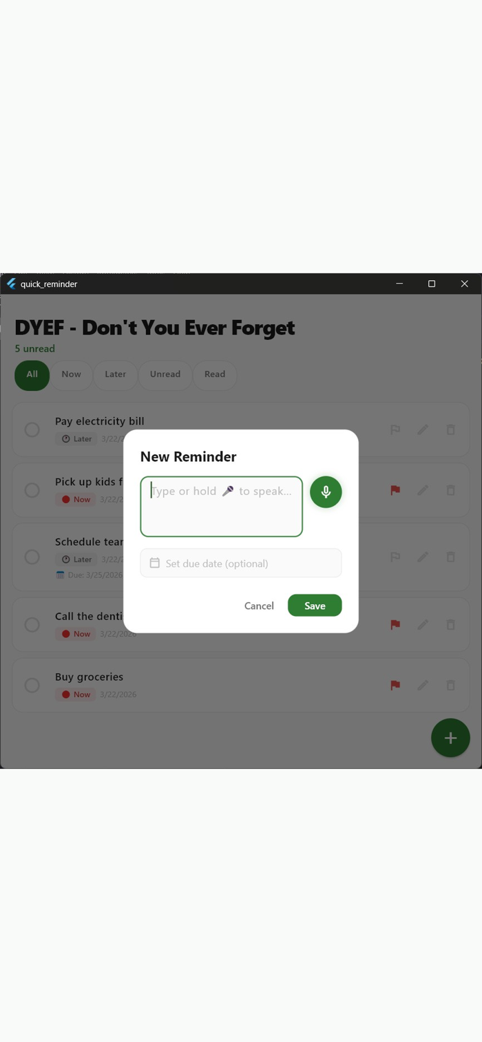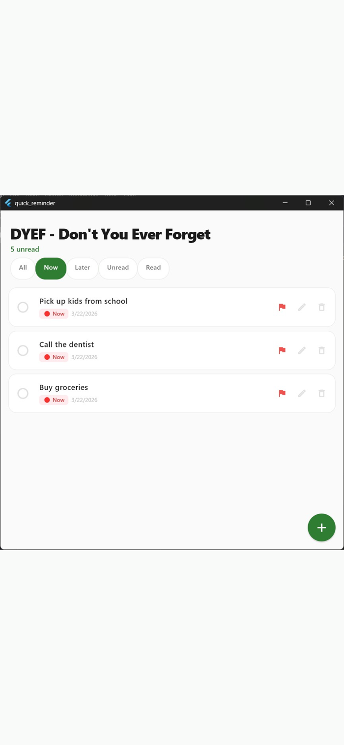 DYEF是一款简单私密的提醒应用。无需账户、云端和订阅,一次付费永久使用。能快速打字或语音创建提醒,用“现在”“稍后”标记分类,可设置到期日,标记已读未读,支持过滤、编辑、删除。具备语音输入功能,所有数据本地存储,无账户要求,无广告、追踪和分析,无订阅,仅需一次性购买。