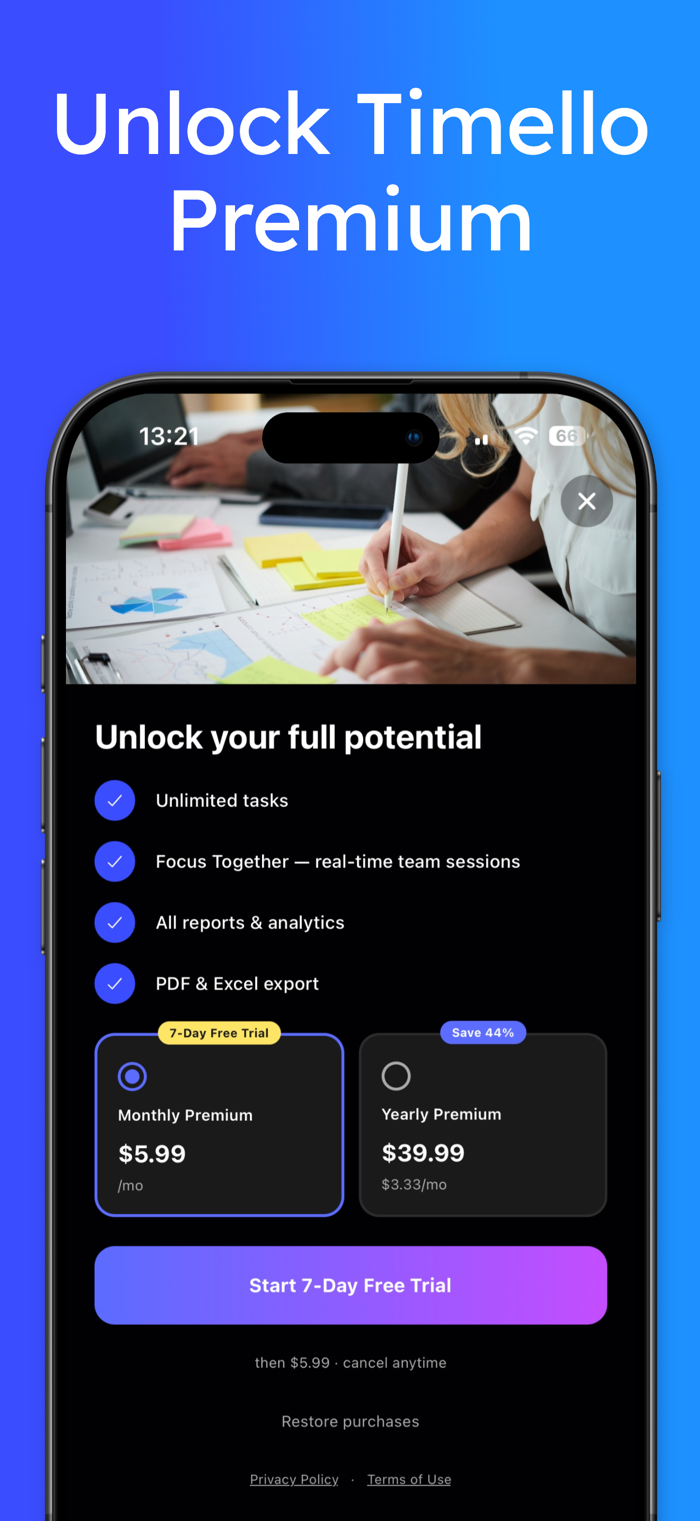 Start free with up to 3 tasks per day, tags, voice input, and today's report. Upgrade to Timello Pro for unlimited tasks, Focus Together sessions, all report periods, and export features. Choose monthly or yearly plan.