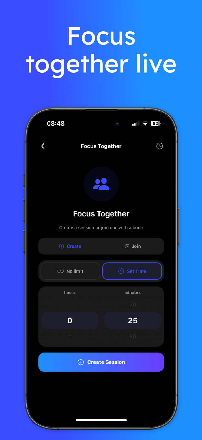 Invite friends, teammates, or study partners to a shared focus session. Share a 6-character code (or a direct link), set a sprint duration, and work in sync — everyone's timer starts at the same moment. See who's in the room, what they're working on in real time, track your own tasks within the session, and review your shared history afterwards.