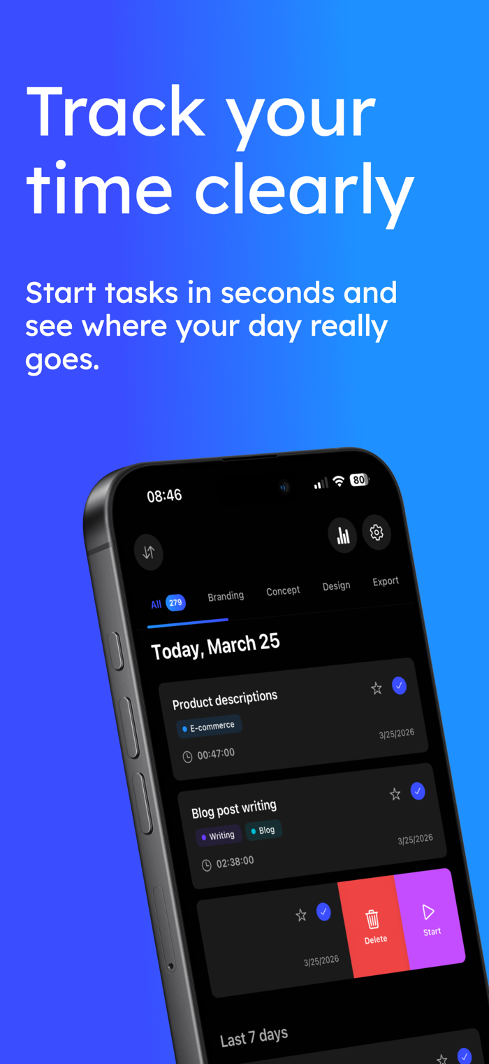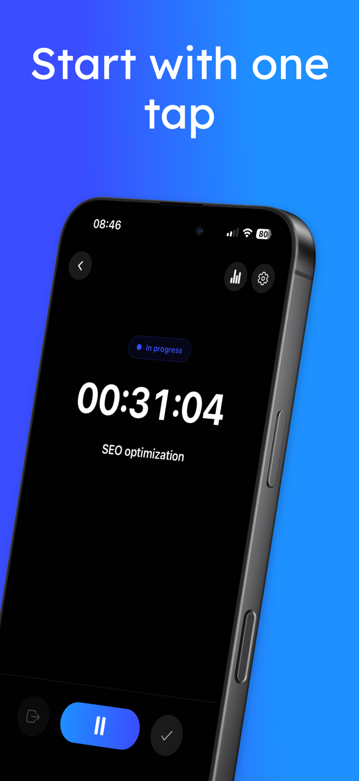 Just tap, type (or speak!) your task name, and press play. Pause and resume anytime. Your timer persists even if the app closes. No complicated setup, no learning curve. Timello gets out of your way so you can focus on what matters.