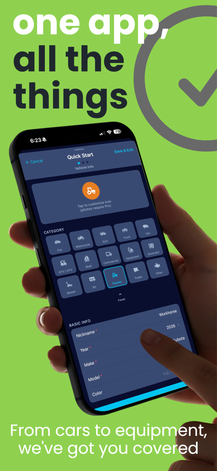 Cars, trucks, SUVs, vans, motorcycles, ATVs, boats, RVs, trailers, tractors, mowers, generators, and more. Equipment categories automatically switch to hour-meter terminology throughout — no awkward "miles" labels on your riding mower.