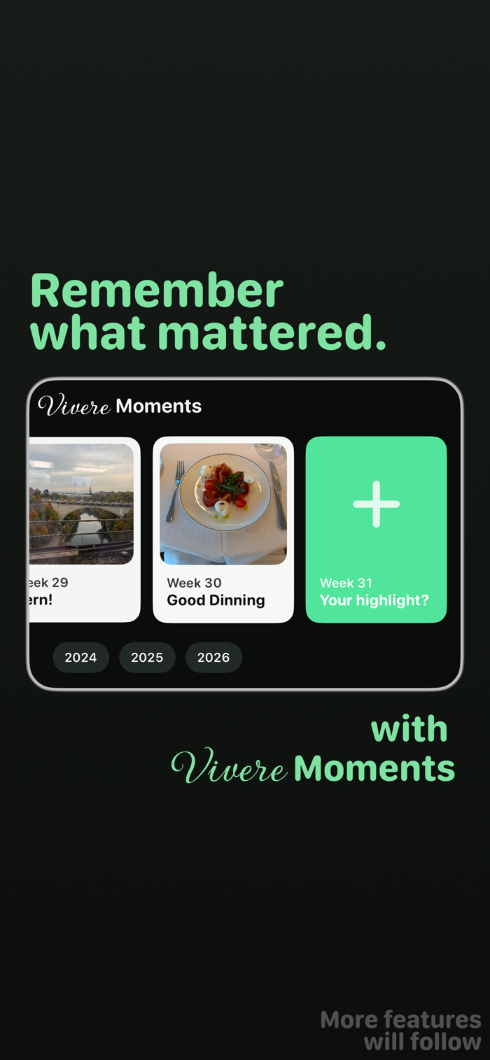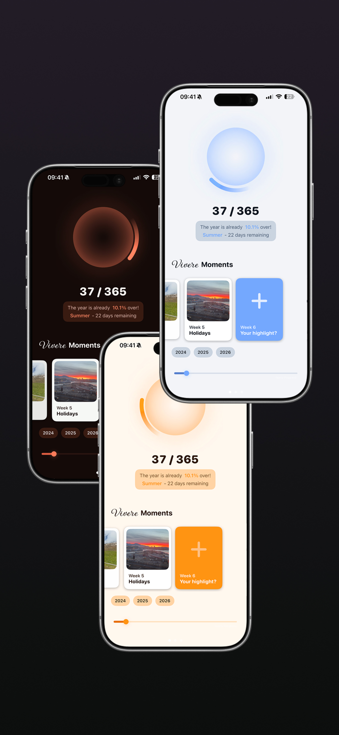 Vivere keeps you grounded without busy metrics. Track your year progress, see the current season at a glance, and place each week in the context of the whole year. Capture one small highlight every week — a moment worth remembering.