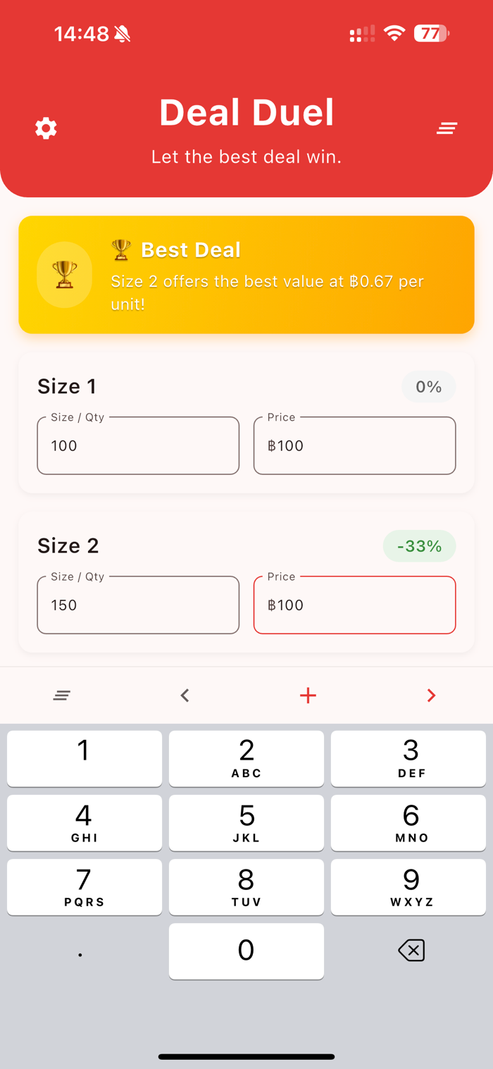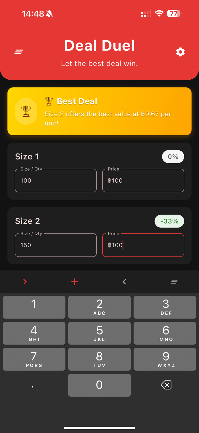 Deal Duel is designed for real-world use — with simplicity and customization at its core.mart and simple unit price comparison app that helps you find the best value by comparing price per unit across multiple product sizes.