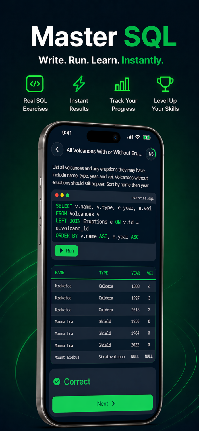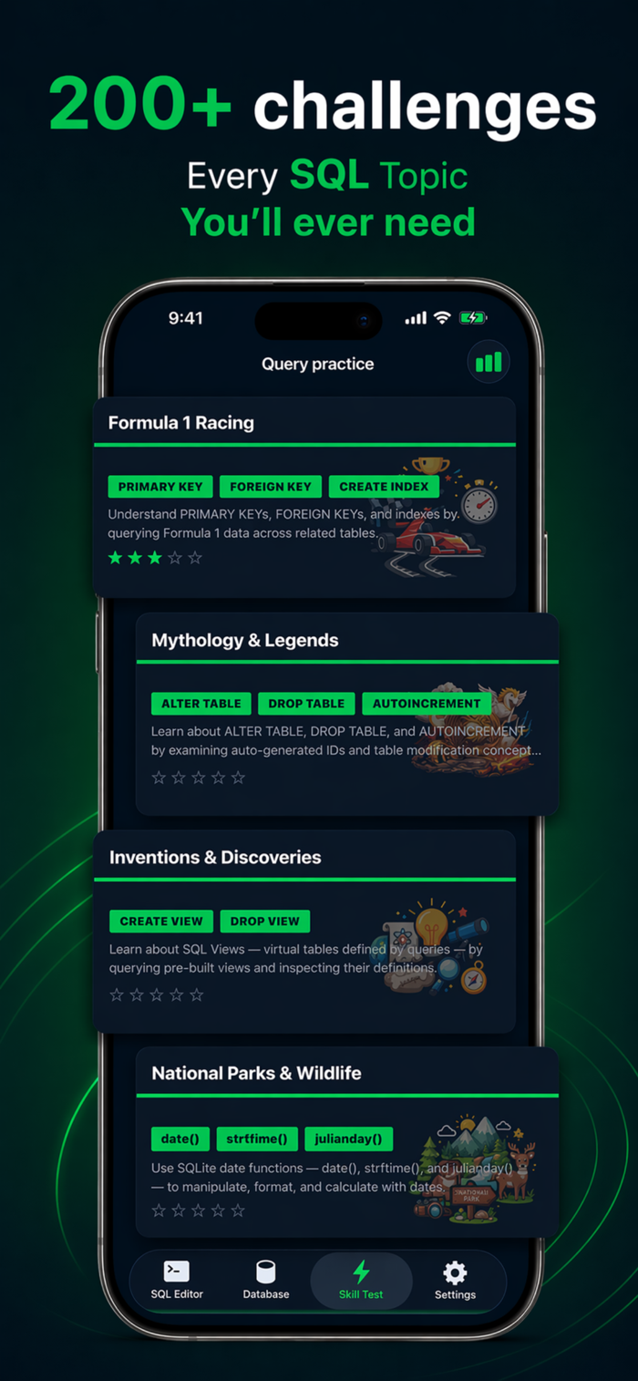 SQL Editor Pro是iPhone上唯一具备真实SQL编辑器、真实数据库及200多个实践挑战的应用。区别于多数给测验的SQL应用,它提供数据库,让用户在全功能编辑器中通过探索真实表、运行自己的查询来学习。有语法高亮和智能自动完成功能,能查询、检查和探索真实SQLite数据库,即时在干净可滚动表格视图中看到结果,还能在数据与结构视图间切换,另有200多个跨20个主题板块的挑战助用户学SQL。