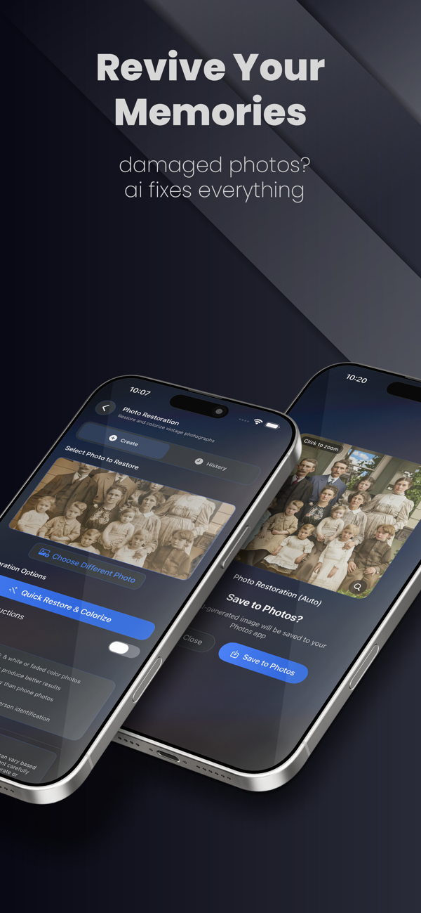 AI PHOTO RESTORATION Bring old, blurry, or damaged photos back to life. Our "Photo Rescue" technology enhances facial details, removes scratches, and colorizes black-and-white images with incredible accuracy. Perfect for preserving family albums!