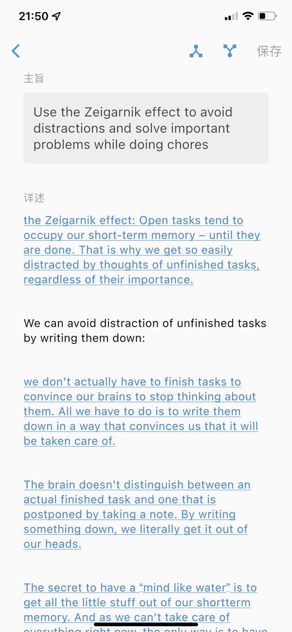 记录笔记的时候键盘上面有一排工具栏,第一个按钮是用来链接笔记的。笔记之间的链接是这款app重点优化的功能,在笔记详情页面,你可以点击上方的按钮来查看这条笔记有哪些链接,同时有哪些笔记链接了这条笔记。笔记的链接就如网址一样以蓝色高亮显示,长按链接就可以跳转到那条笔记的详情。