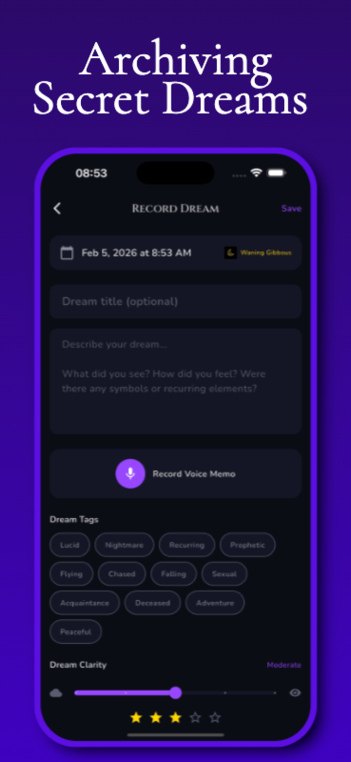 Somnium helps you capture your dreams instantly, explore their meanings, and practice lucid dreaming — all in a completely private, offline environment.