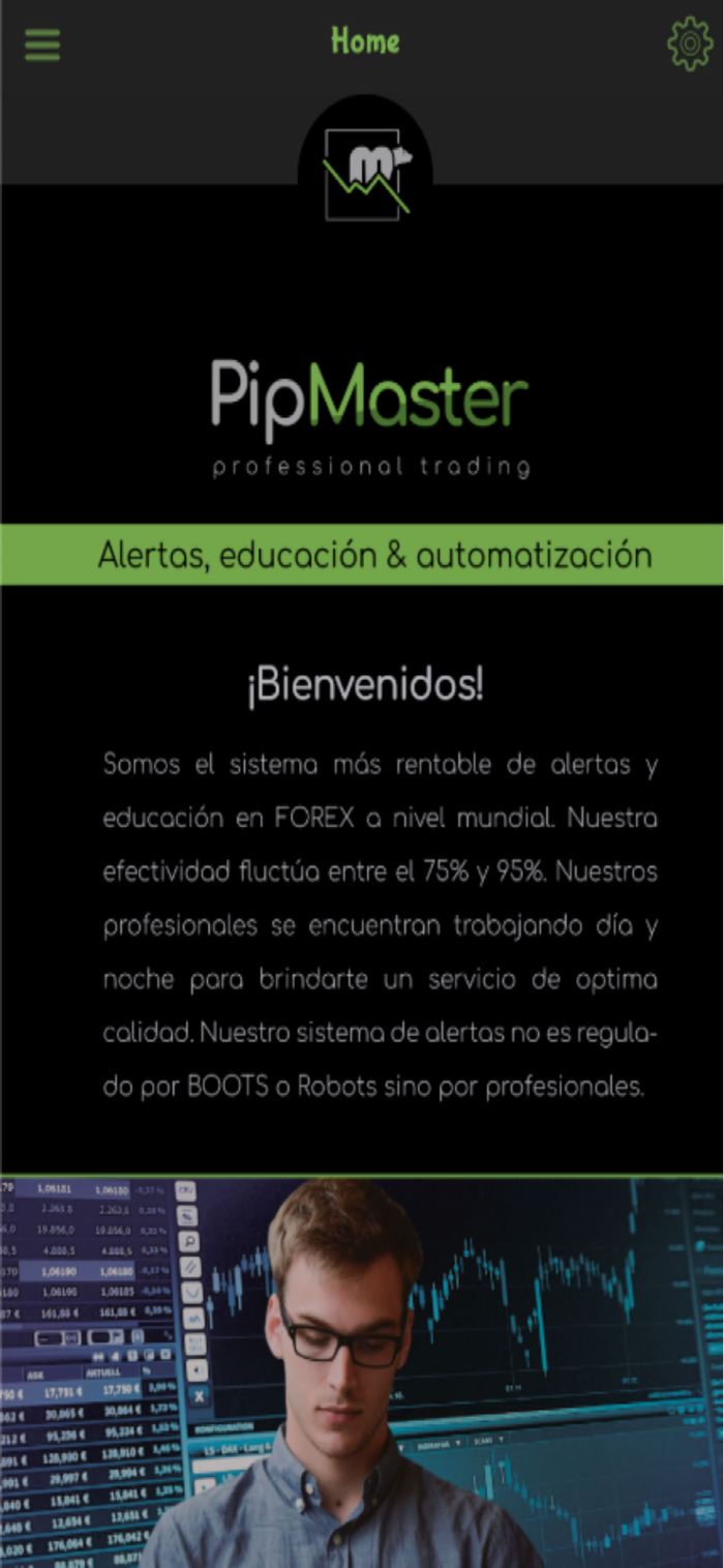 PipMaster es un sistema de alertas o trade escritos que les llegan a los usuarios premium mediante la app. Las alertas tienen un grado de efectividad del 85 a 90%. Además la app incluye diferentes servicios de fidelización y aprendizaje.