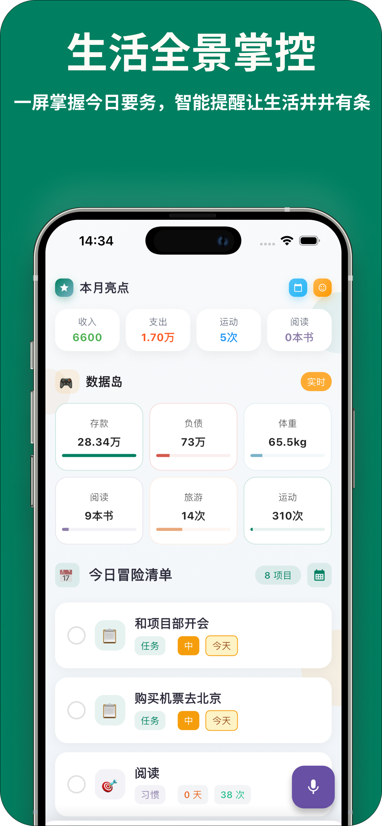 生活管理 App 是一款多功能效率工具,涵盖任务管理、习惯养成、财务记账、健康记录、阅读跟踪、旅行足迹与心情日记等。具备任务与目标创建管理、习惯自定义打卡、财务管理统计、健康体重运动记录分析、阅读记录统计、旅行足迹规划回忆、心情日记分析等功能,还有多维度数据统计分析、智能提醒、积分等级体系,会员可解锁高级功能,提供多种订阅方案。