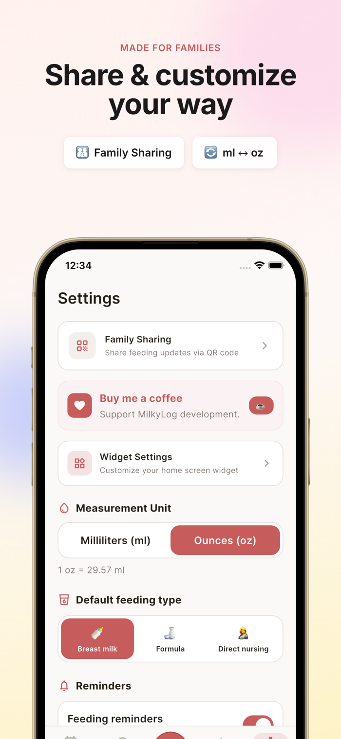 Switch seamlessly between milliliters (ml) and ounces (oz) with one tap. Perfect for parents who use different measurement systems or follow international guidelines.