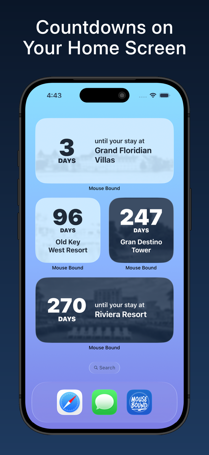 Keep the countdown one glance away. Small, medium, and large widgets put your trip right on your Home Screen with the same resort backgrounds.
