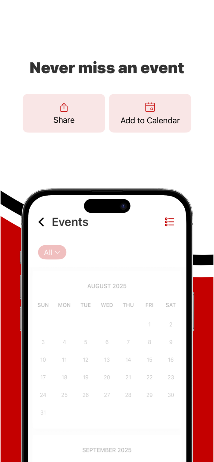 The event section shows a list of events throughout the district. Users can add an event to their calendar to share the event with friends and family with one tap.