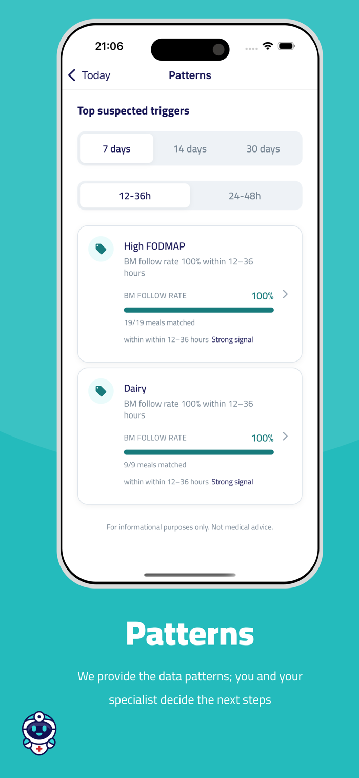 NOTE: GutSpy provides pattern insights based on your logged data. These are not medical diagnoses or recommendations. Please consult a healthcare professional for medical advice.