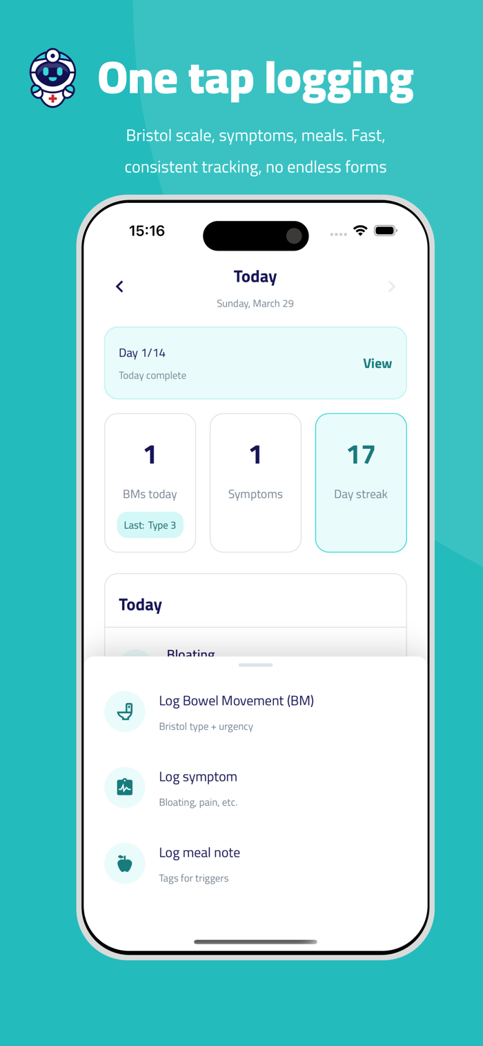 One-Tap Stool Logging — Bristol scale, urgency, and pain in seconds