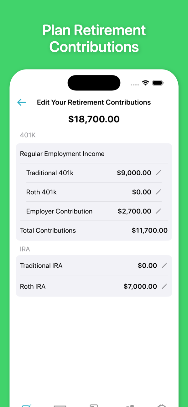 Plan your future with support for Traditional and Roth 401(k), IRA contributions, employer matching, HSA, and FSA — all with current contribution limits.