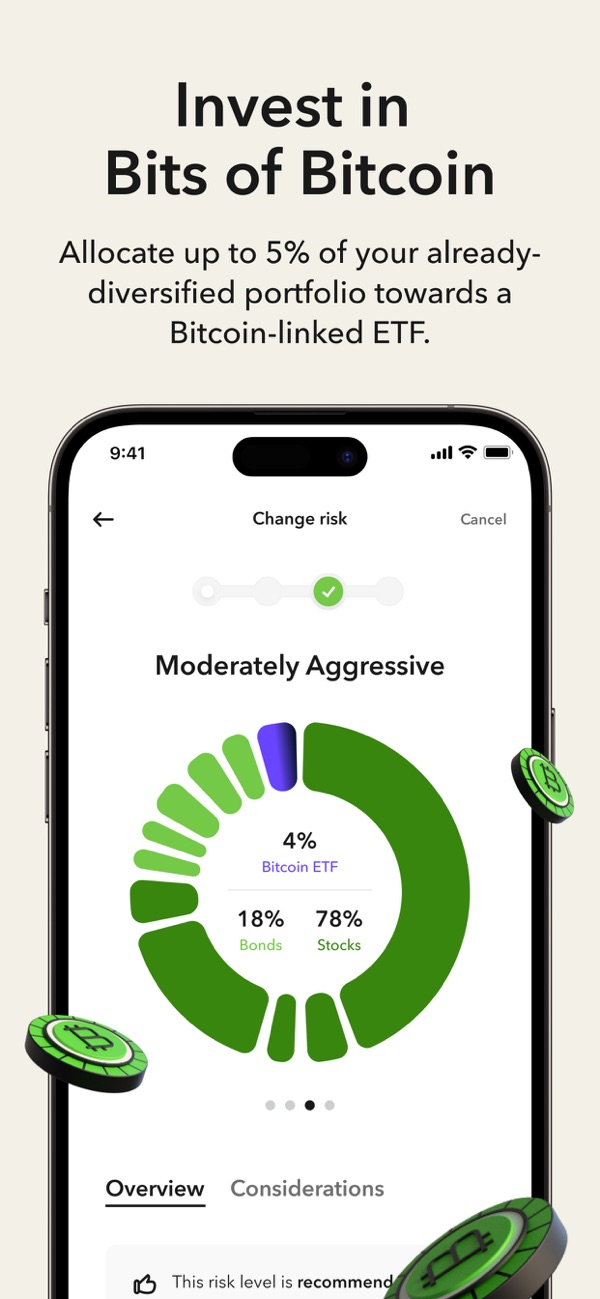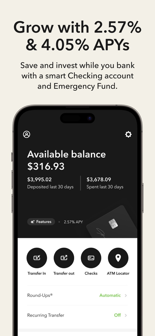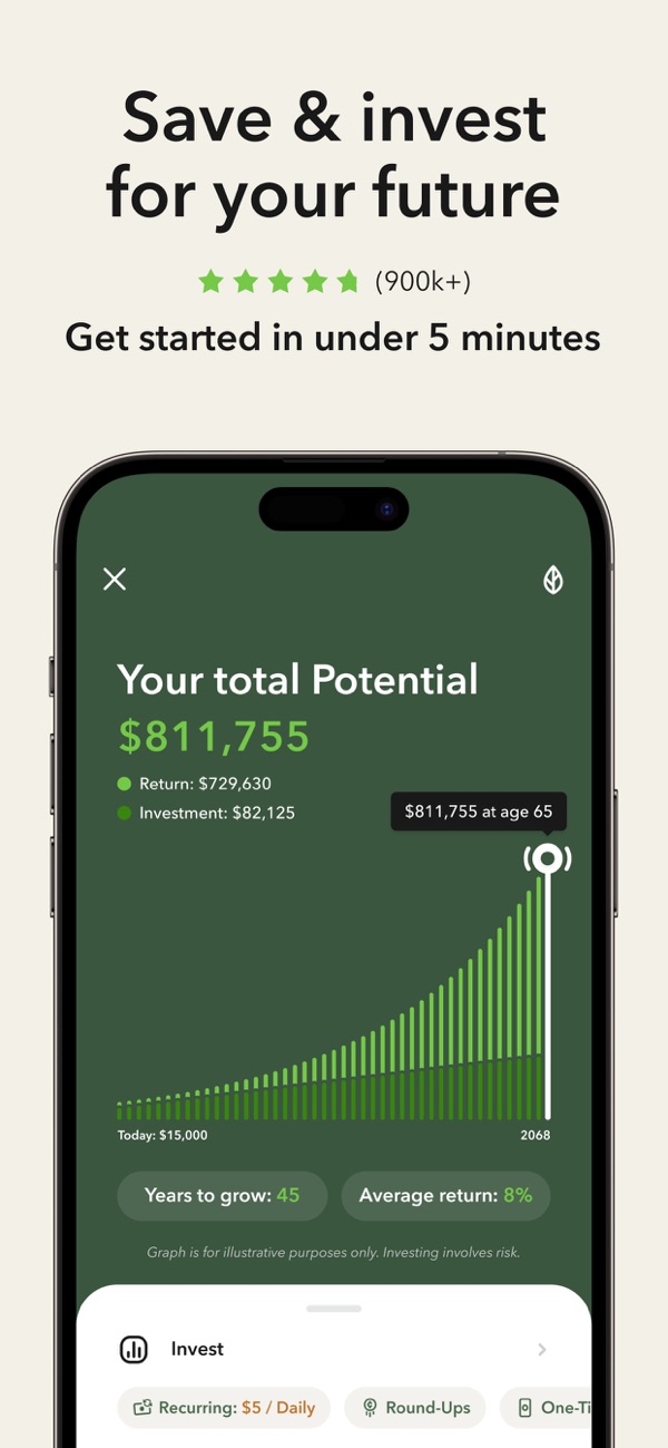 Your money is automatically invested into our expert-built, diversified ETF portfolios. You can Invest Spare Change® each time you make a purchase with the Round-Ups® feature or set up automated recurring investments starting as low as $5.