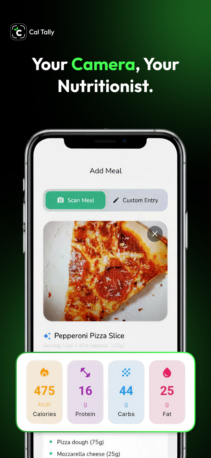 CalTally是智能AI驱动的卡路里追踪器,让健康管理轻松掌控。扫描食物,它瞬间分析卡路里、蛋白质、碳水化合物和脂肪,无需手动记录。具备AI食物识别,拍照秒识食物并估算营养值;智能卡路里追踪,依饮食习惯智能记录;提供详细营养洞察,助于体重管理与健康生活;还有个性化进度追踪激励你。隐私政策:https://caltally.com/privacy,使用条款:https://caltally.com/terms
