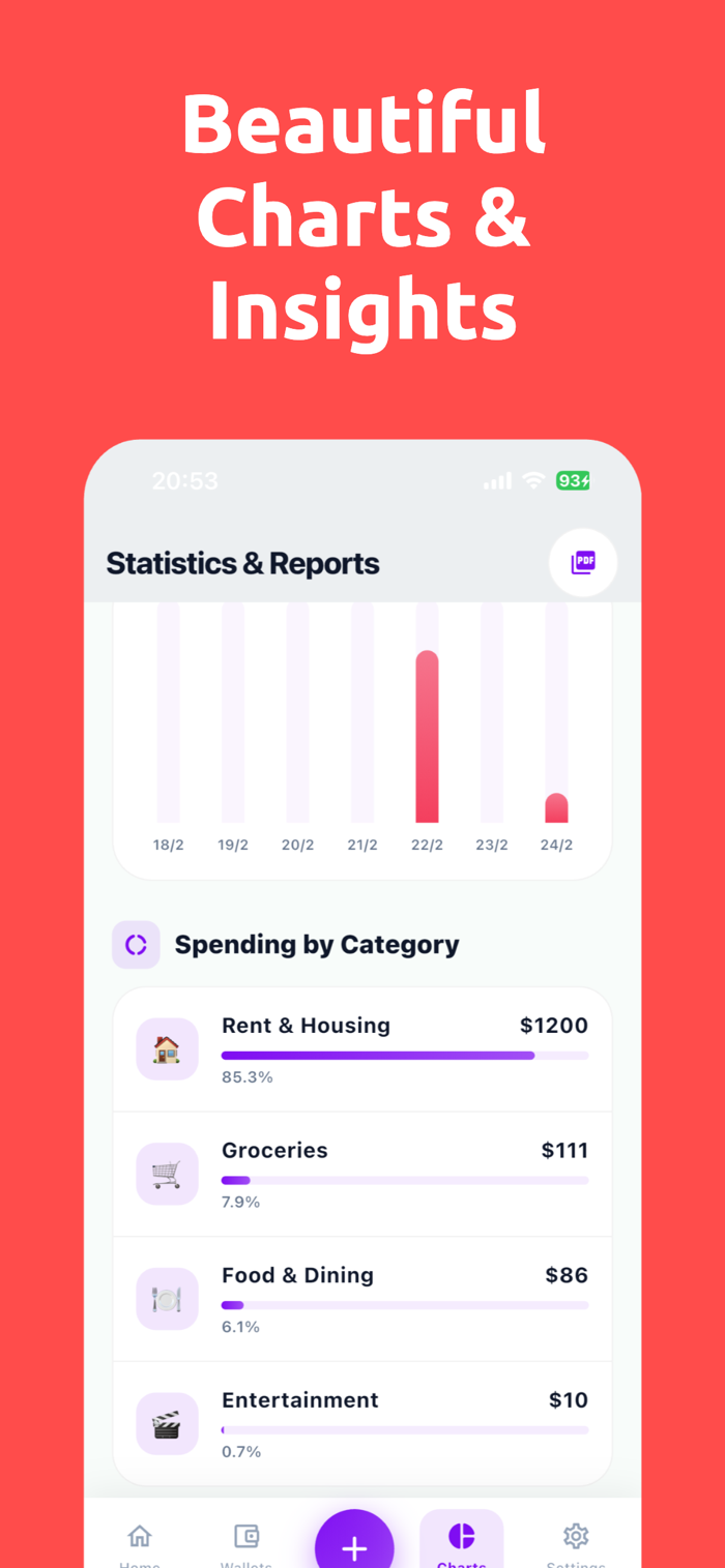 * Charts & Statistics: Analyze spending by category. Track monthly trends and savings rate with beautiful interactive charts.