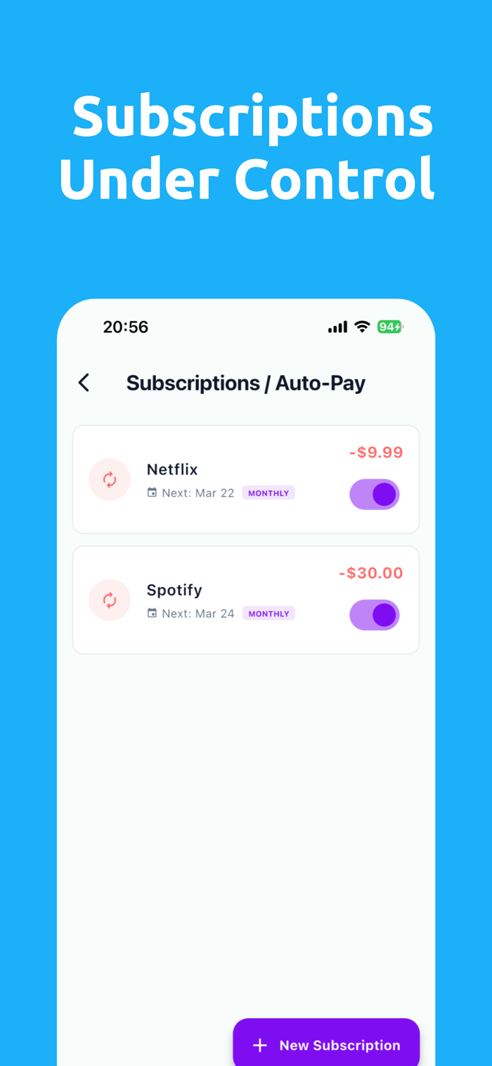 * Subscription Tracking: Keep tabs on Netflix, Spotify, rent, and other recurring expenses. See monthly and yearly totals at a glance.