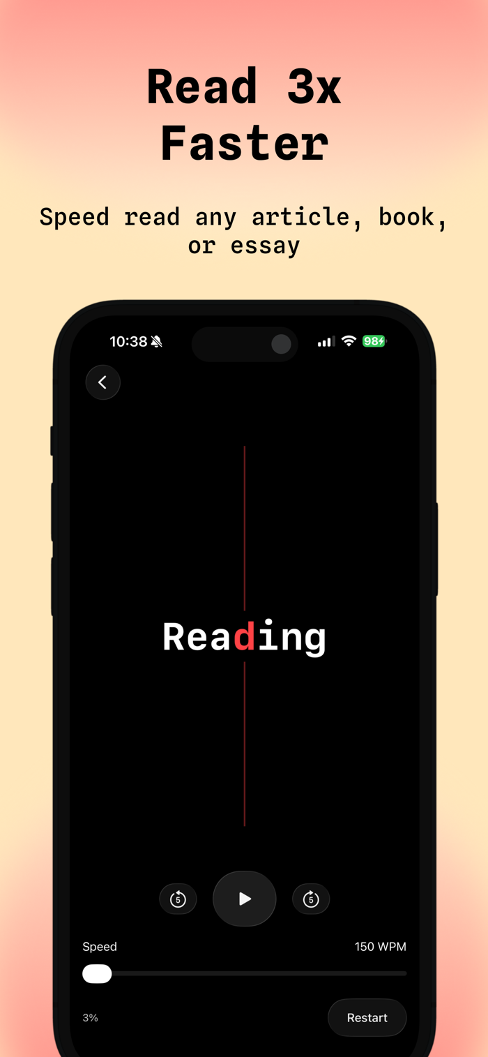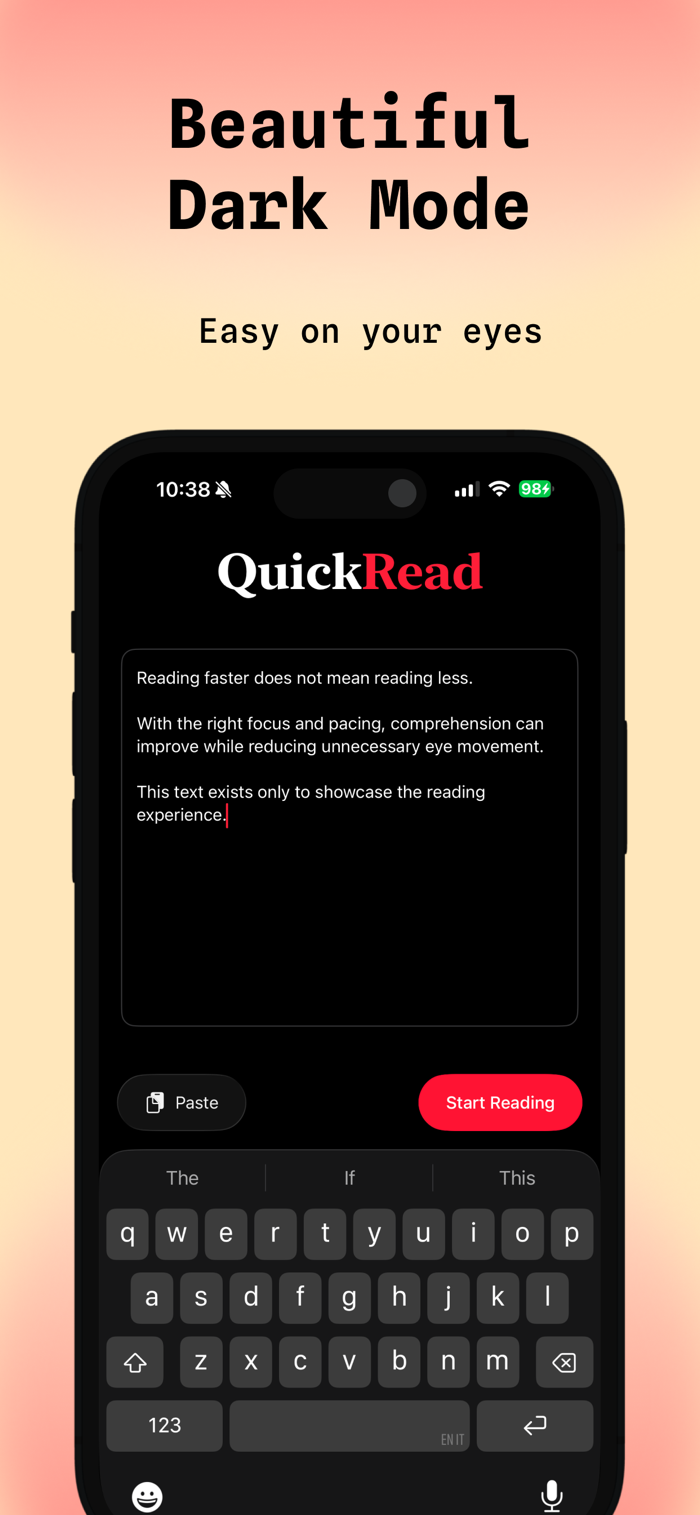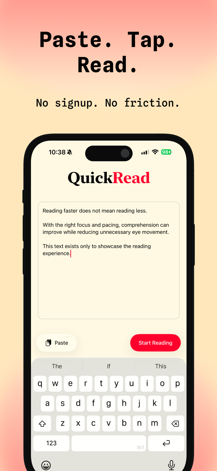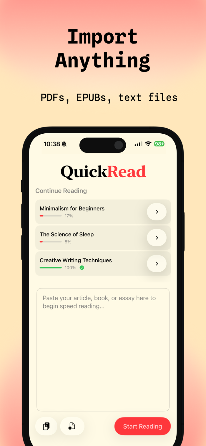 Quick Read利用RSVP技术逐字显示文本,助您快速阅读并保持专注理解。可粘贴文本或导入PDF、 EPUB文件,点击开始阅读,文字逐字居中显示,阅读速度可在100至900+字每分钟调整,进度自动保存。其消除传统阅读中眼睛跨行跳跃的低效,具备PDF和 EPUB导入、自动进度保存、阅读速度可调、支持明暗模式等功能,适用于新闻文章、研究论文等各类需快速阅读的内容。