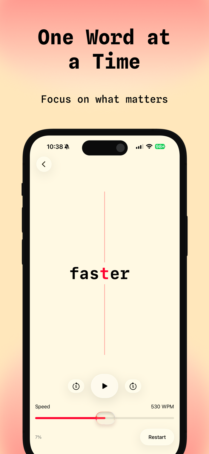RSVP技术逐字显示文本,阅读速度可调且自动保存进度