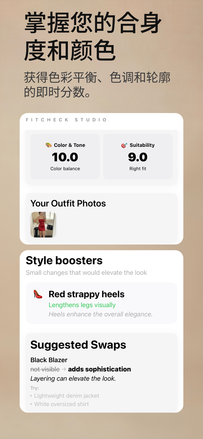 Fitcheck Studio是个人造型助手,上传衣橱几秒内可得无限穿搭组合。拍摄衣服照片构建数字衣橱,依风格、天气和计划获个性化推荐,节省早上规划时间,发现新组合。主要功能有每日个性化风格推荐、造型见解与反馈、保存喜欢的穿搭。适合忙碌专业人士等。与其他时尚应用不同,它理解独特风格,建议喜欢的穿搭,智能简洁,保护隐私,衣橱照片私密安全,不与第三方分享数据。