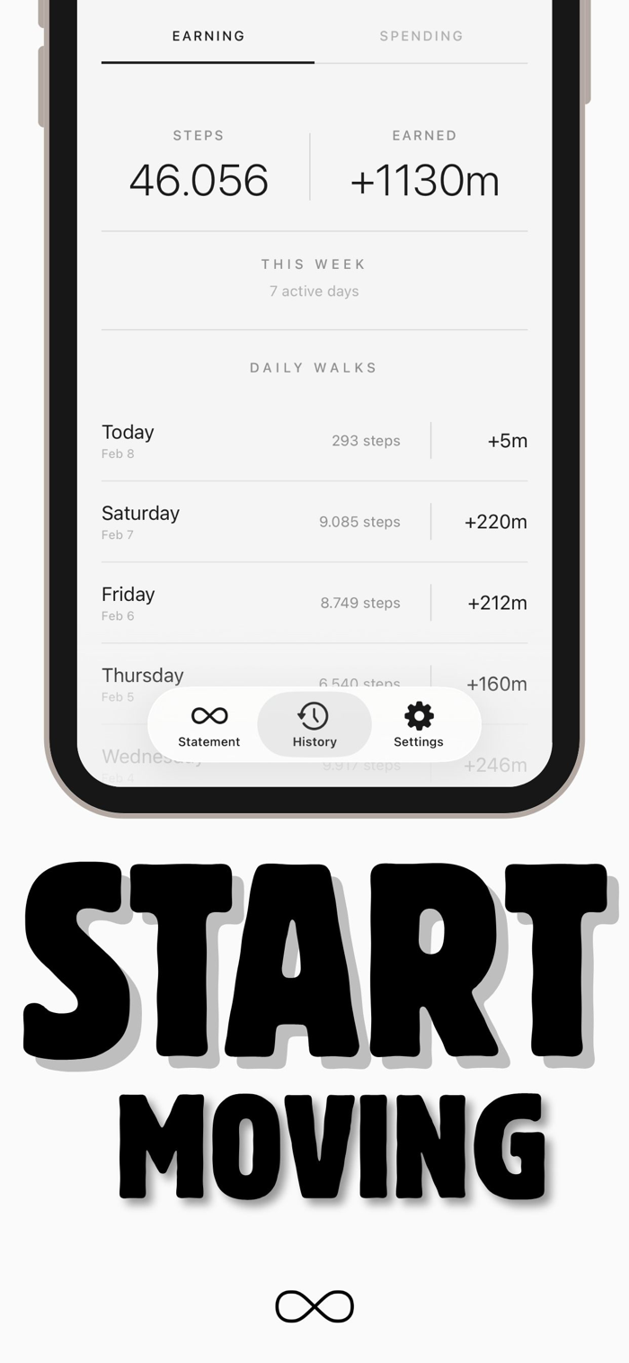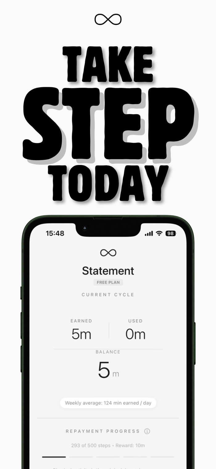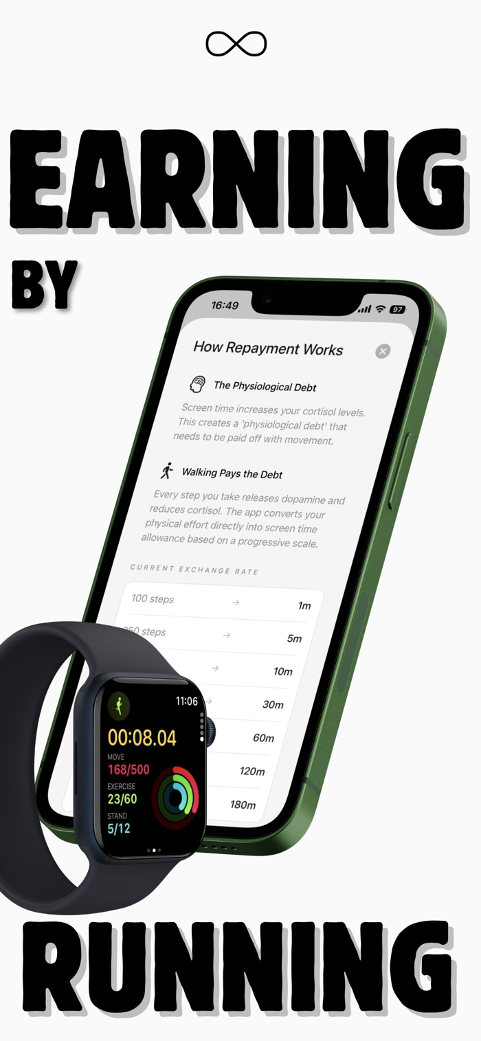Walk to earn screen time. Example: every 100 steps earns 1 minute. No steps, no scrolling.