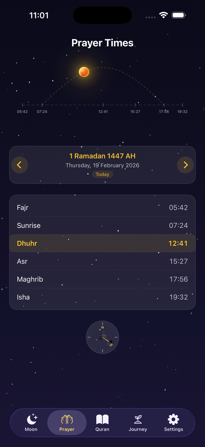Prayer times calculated mathematically for your exact location using trusted methods (Muslim World League, ISNA, Makkah, and more). Beautiful sun arc visualization shows the day's progress. Supports Hanafi and Shafi'i madhab.
