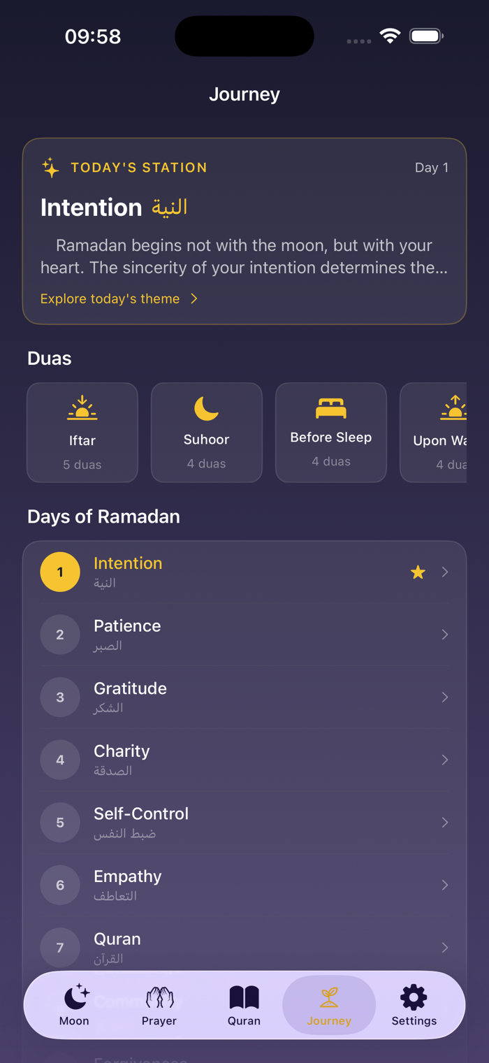 The home screen features a stunning crescent moon that mirrors the real Islamic lunar phase — from the first sliver of Hilal to the radiant full moon and back.