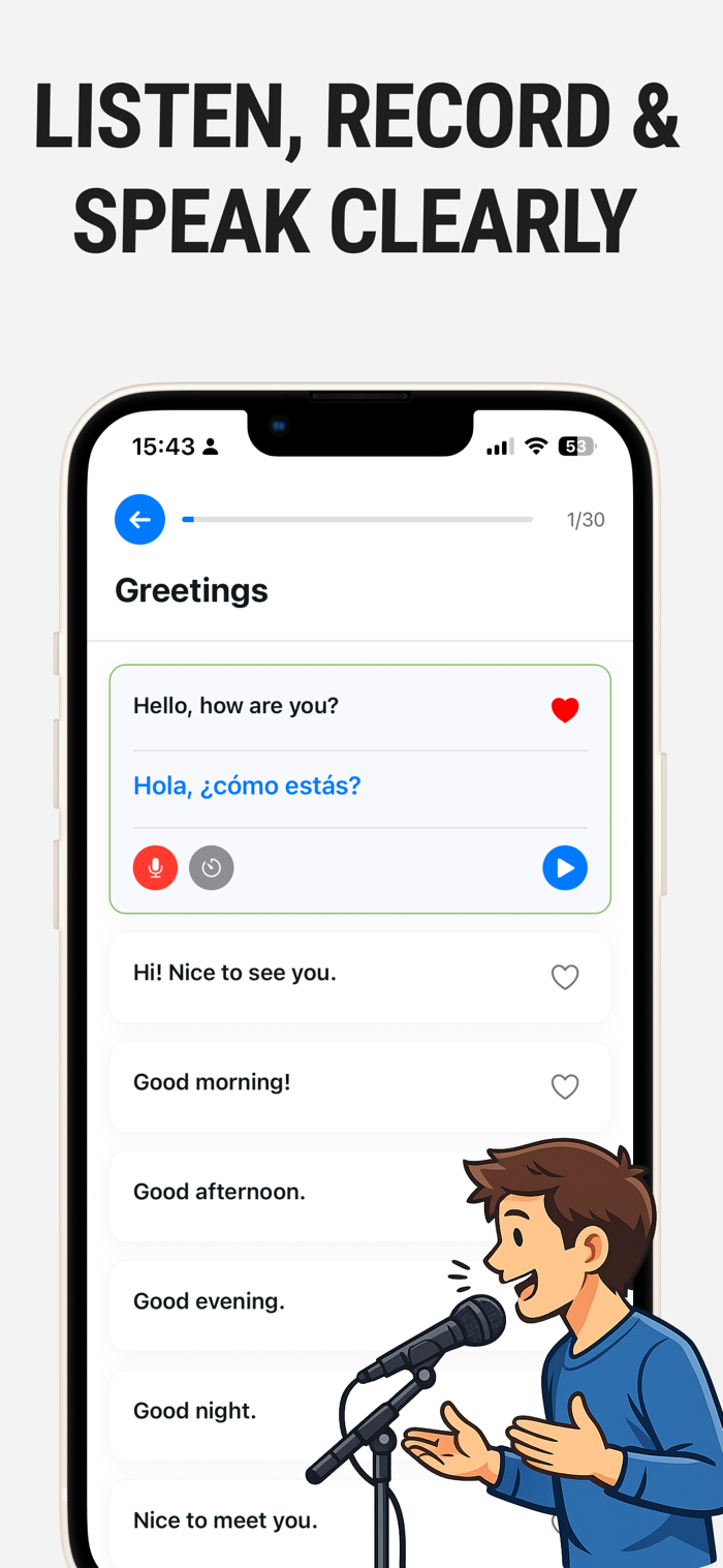 With integrated TTS technology, you can listen to the official Spanish pronunciation practice for beginners for every phrase. To improve Spanish speaking skills, the app allows you to record your own voice and compare it directly with the original model. It’s a powerful way to gain confidence before real conversations.