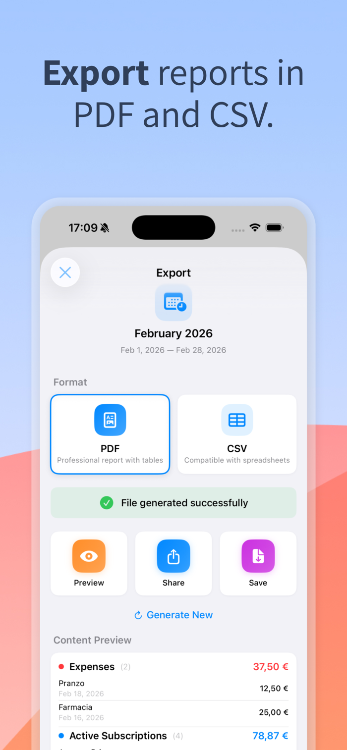 • Stats & Reports: Analyze your spending habits through intuitive charts. Generate professional reports and export them in PDF or CSV format in just a few taps.
