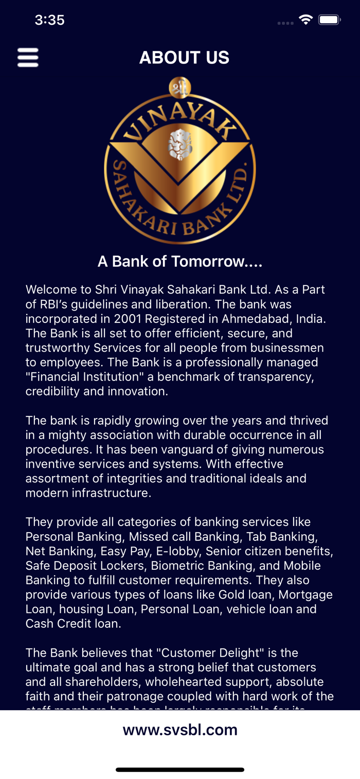 Welcome to Shri Vinayak Sahakari Bank Ltd. As a Part of RBI’s guidelines and liberation. The bank was incorporated in 2001 Registered in Ahmedabad, India. The Bank is all set to offer efficient, secure, and trustworthy Services for all people from businessmen to employees. The Bank is a professionally managed "Financial Institution" a benchmark of transparency, credibility and innovation.