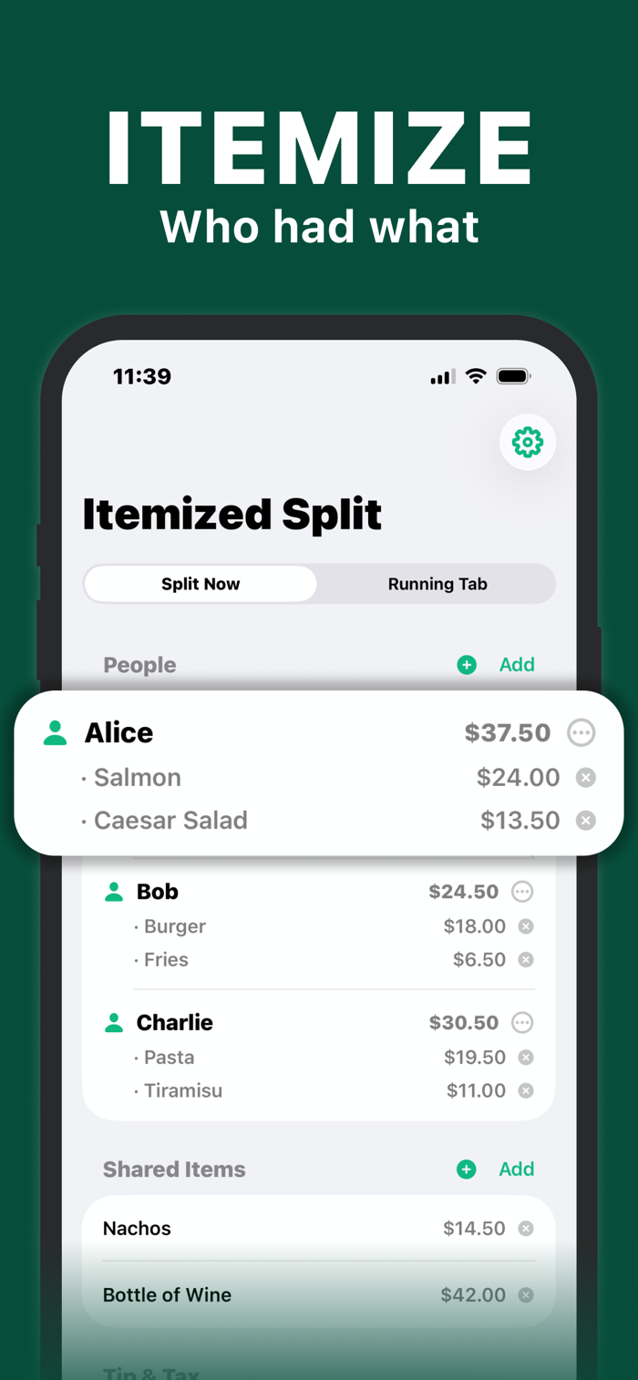 Enter the total, set the tip, and see what everyone owes in seconds.