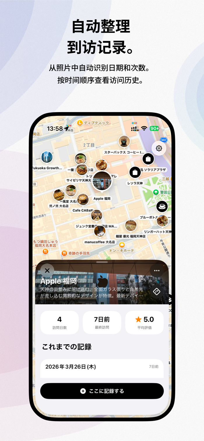 保存照片、撰写简笔、进行评分。通过在地点叠加记录,你上次何时到访、吃了什么、感受如何都会被完整保存。再次到访时,仿佛能与过去的自己重逢。