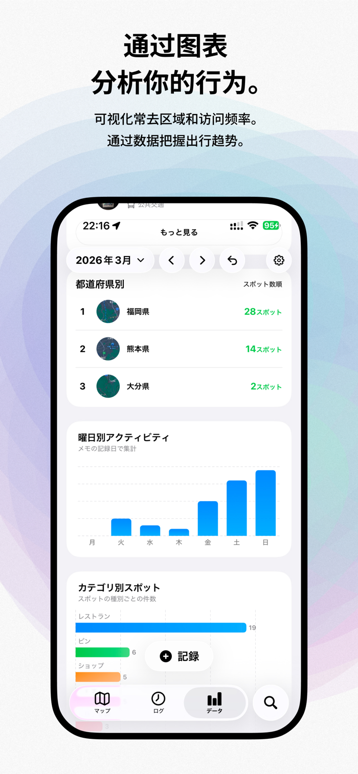 通过图表了解常去的区域和地点类型。你会发现一些连自己都没察觉的生活律动,比如“最近经常去自然景观丰富的地点”。