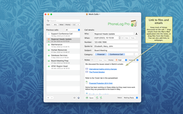 • Rich text notes & links to files and emails