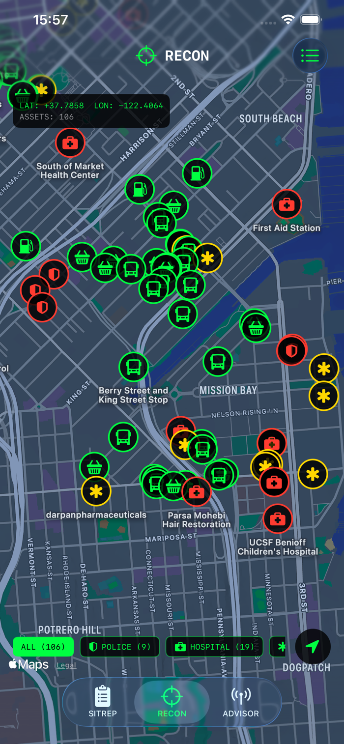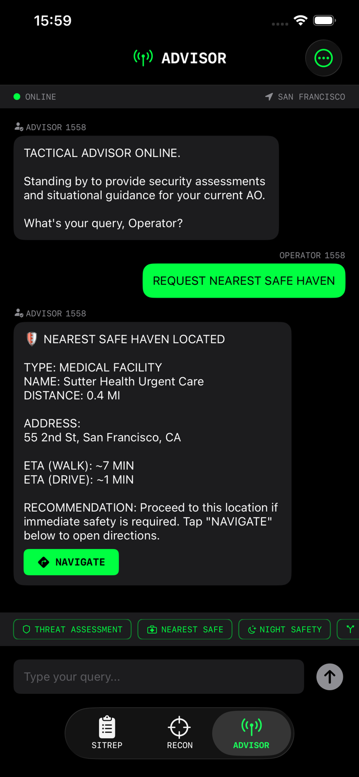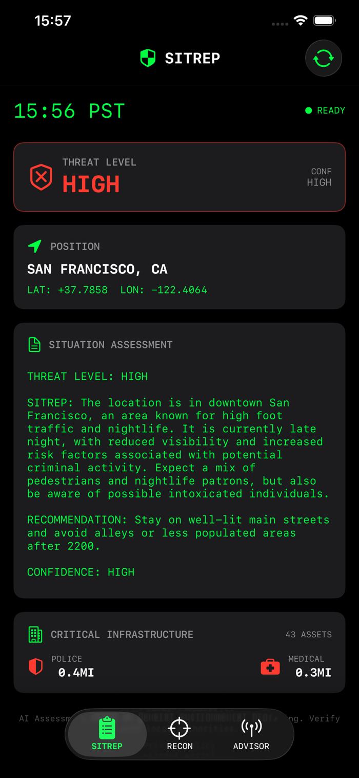 AwareAround是专业级态势感知工具,用于个人安全与战术环境分析。它能将设备变为战术智能终端,聚合本地数据提供即时安全评估(SITREP),含当前位置安全概况AI分析、基于能见度等的风险评估;详细基础设施映射(RECON),突出关键设施、快速定位警局等;还有AI驱动的安全建议(ADVISOR),集成AI安全顾问解答本地风险问题。
